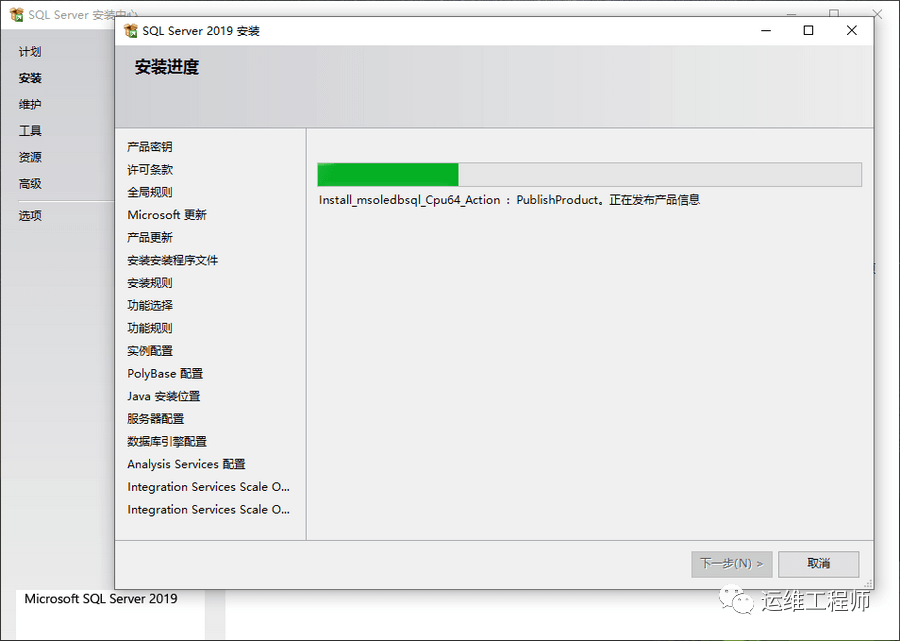 安装程序会检查是否有可能会在运行安装程序时发生的潜在问题。如果检查到故障,请选择“状态”列中的项,以了解详细信息。由于启用的防火墙出现了警告,需要将 SQL Server 的服务端口添加到防火墙,可以后续在添加,下一步即可;