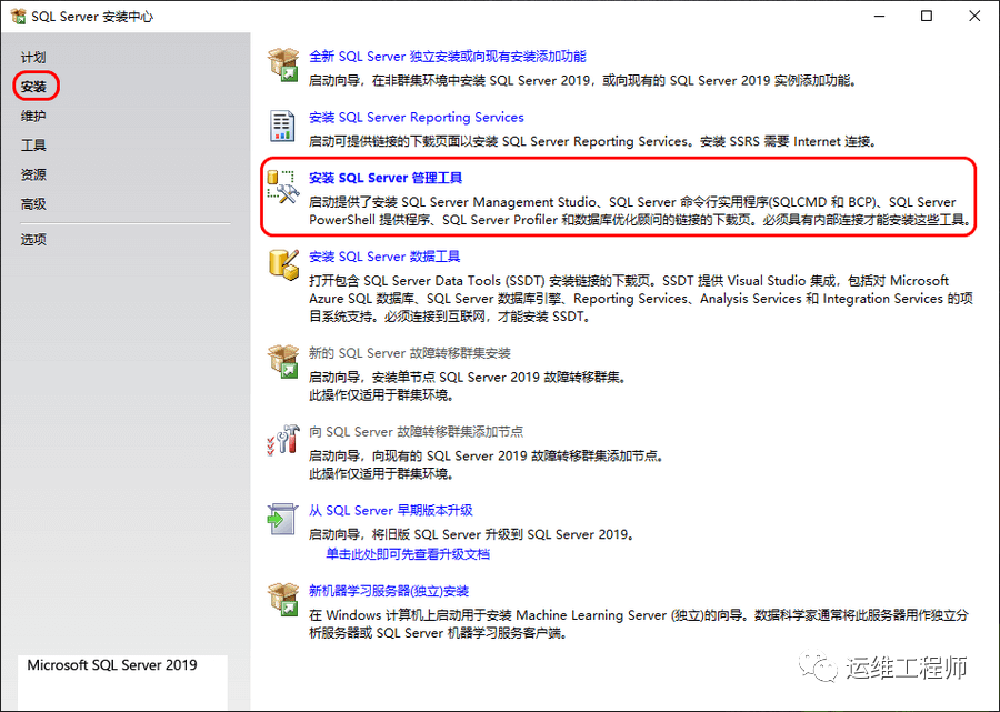 在安装中,点击安装 SQL Server 管理工具,会弹出微软的管理工具下载界面;